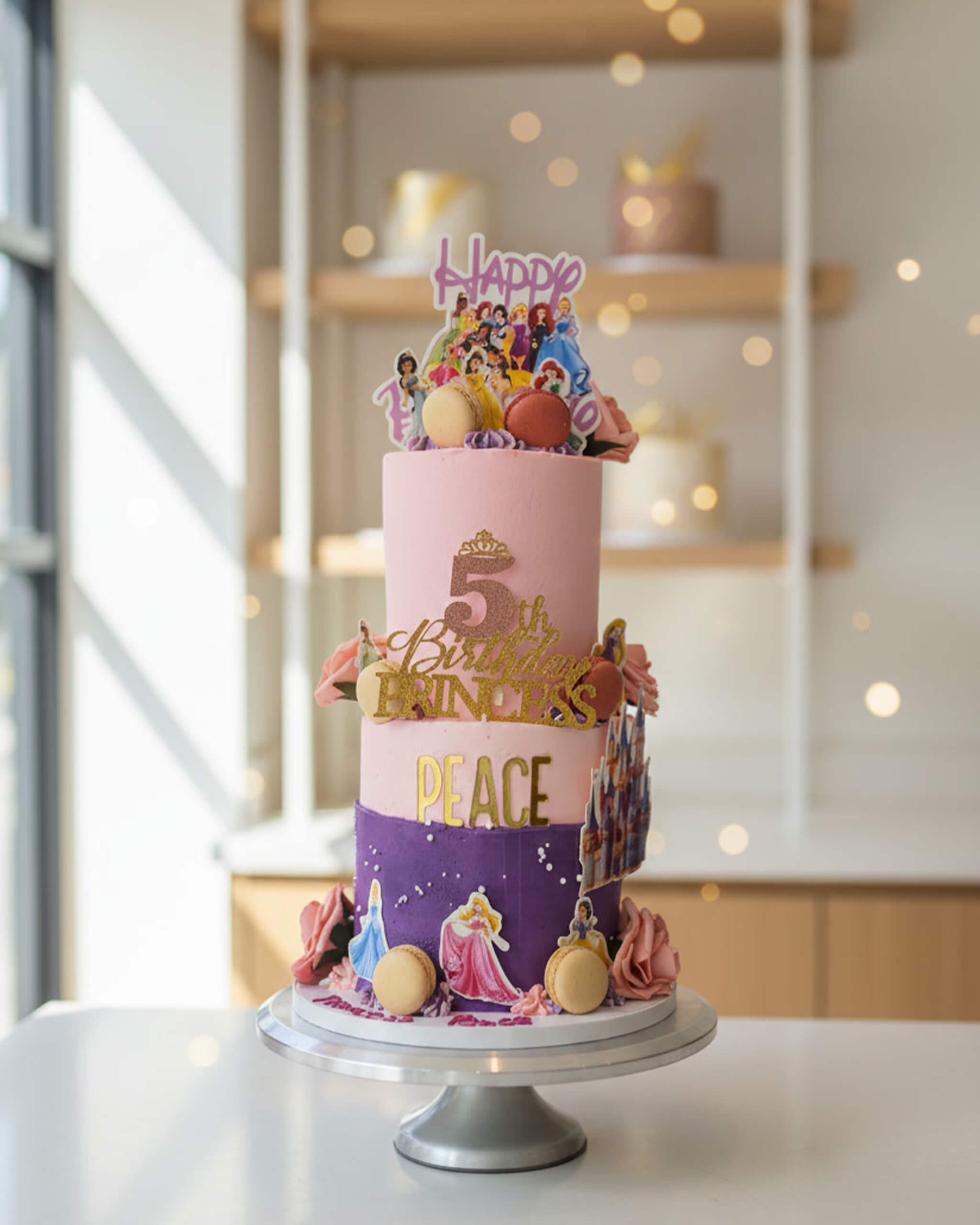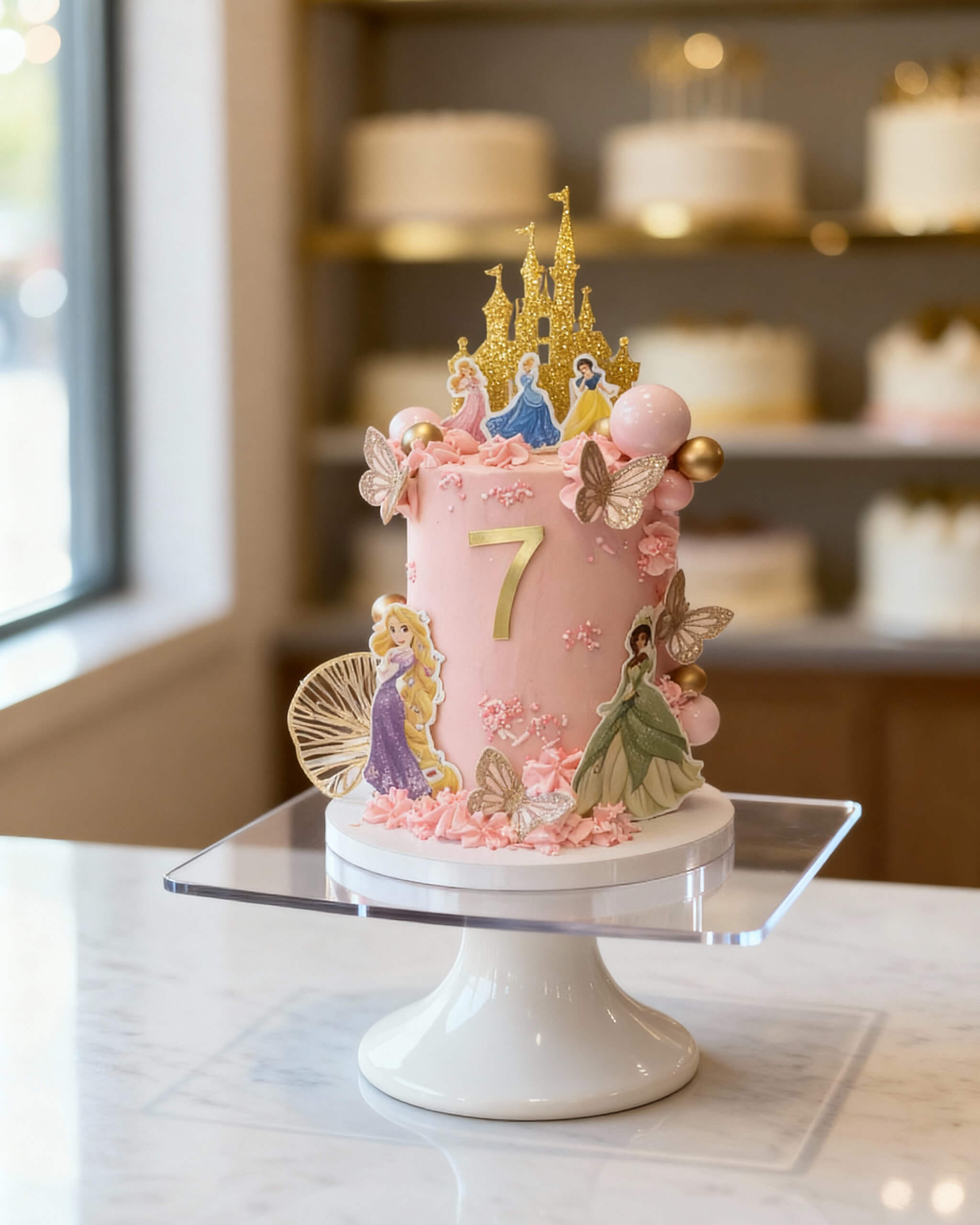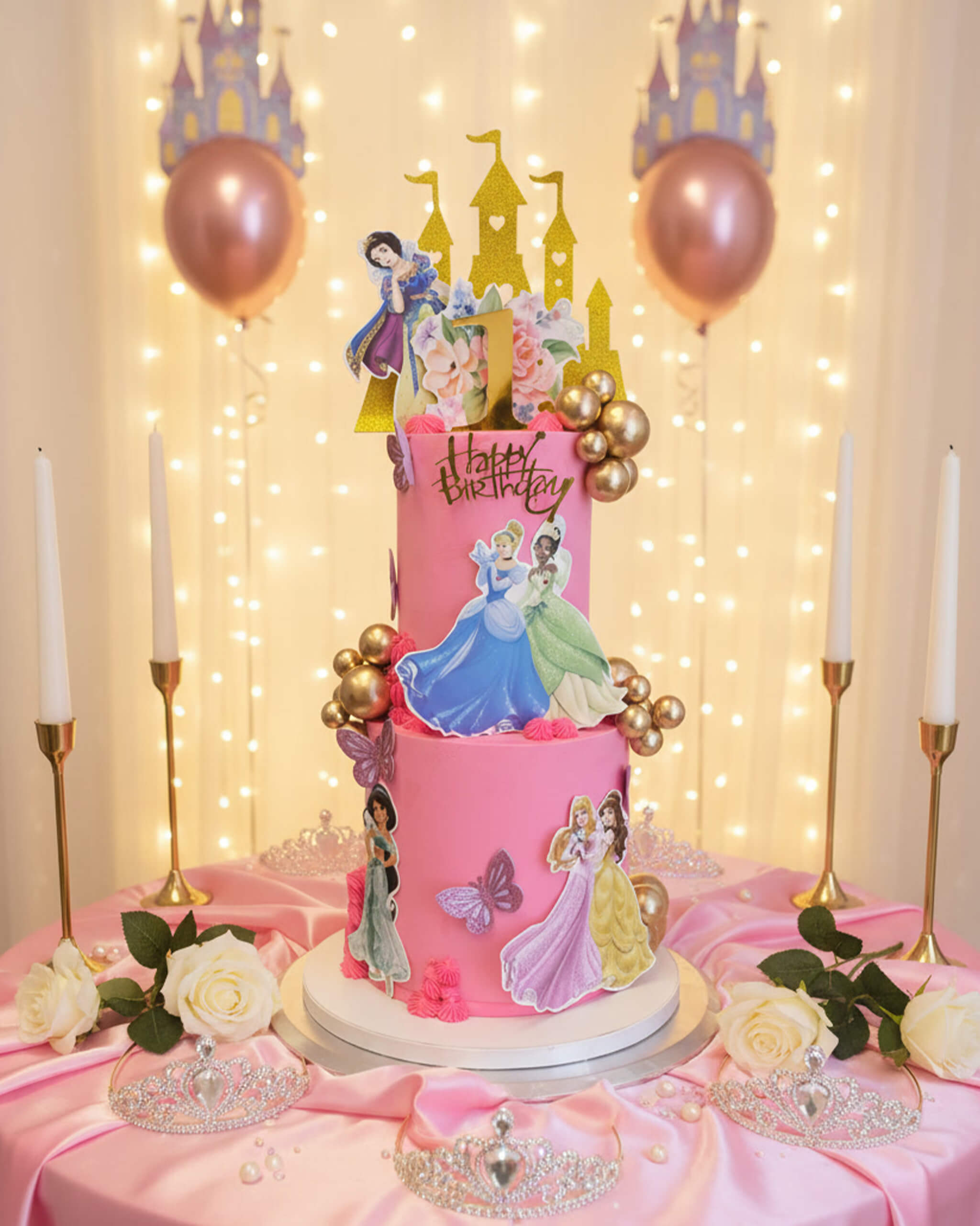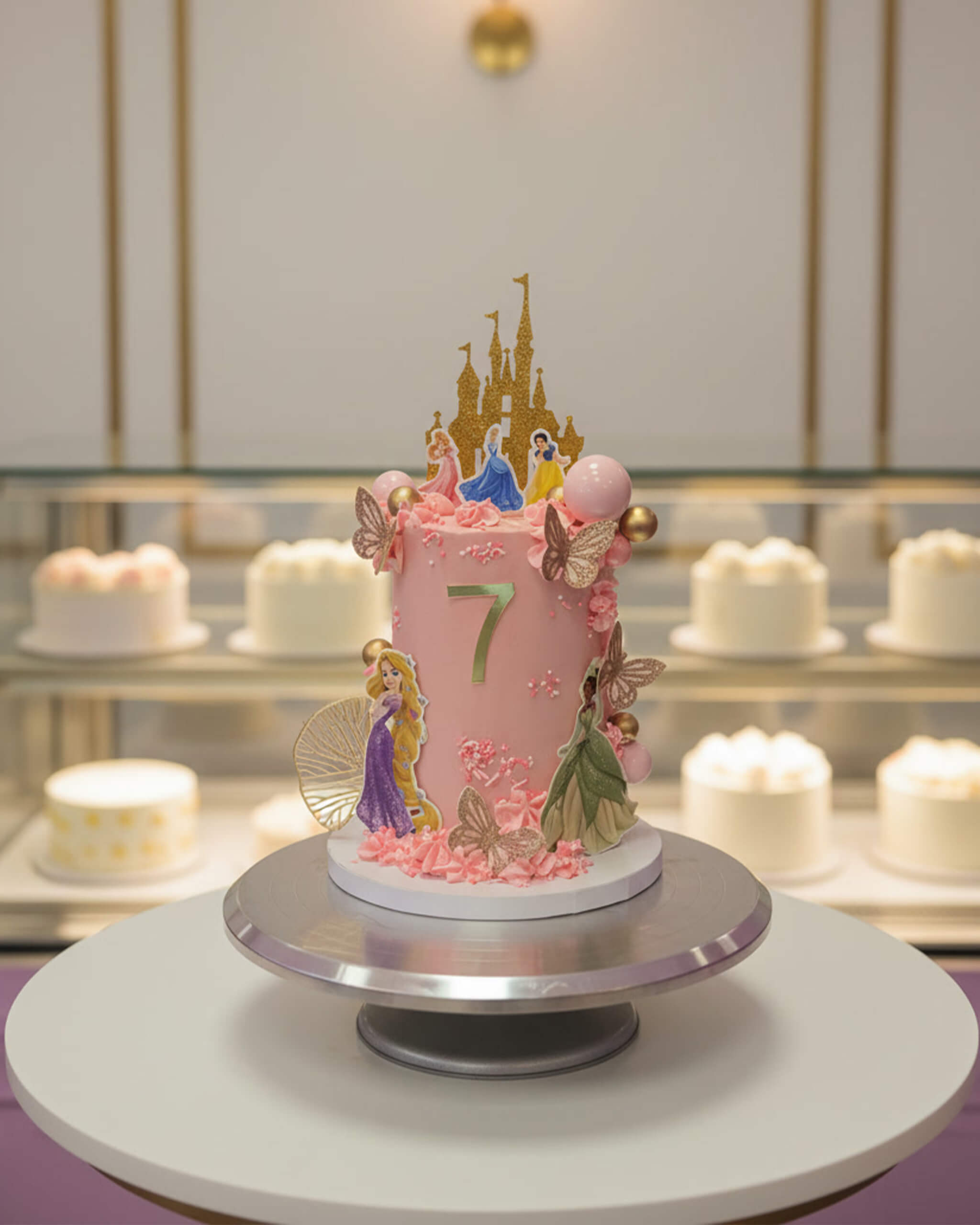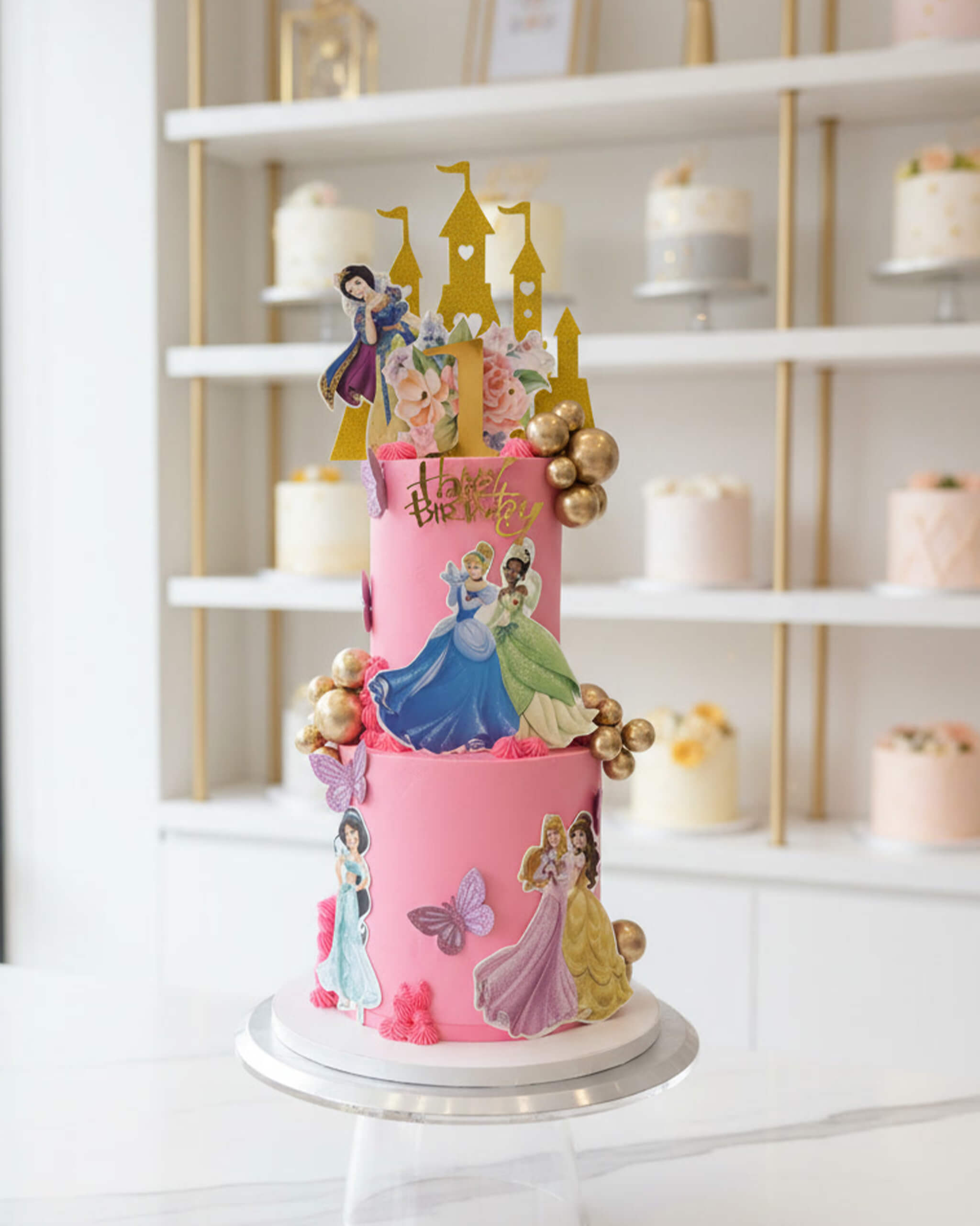 Make their royal dreams come true with our Disney Princess Cake – a fairytale in pink and gold! Soft blush tiers sparkle with a golden castle topper, delicate butterflies, chocolate spheres, and their favourite princesses: Rapunzel, Tiana, Cinderella, Belle, Jasmine, Aurora, and more, all ready to celebrate.