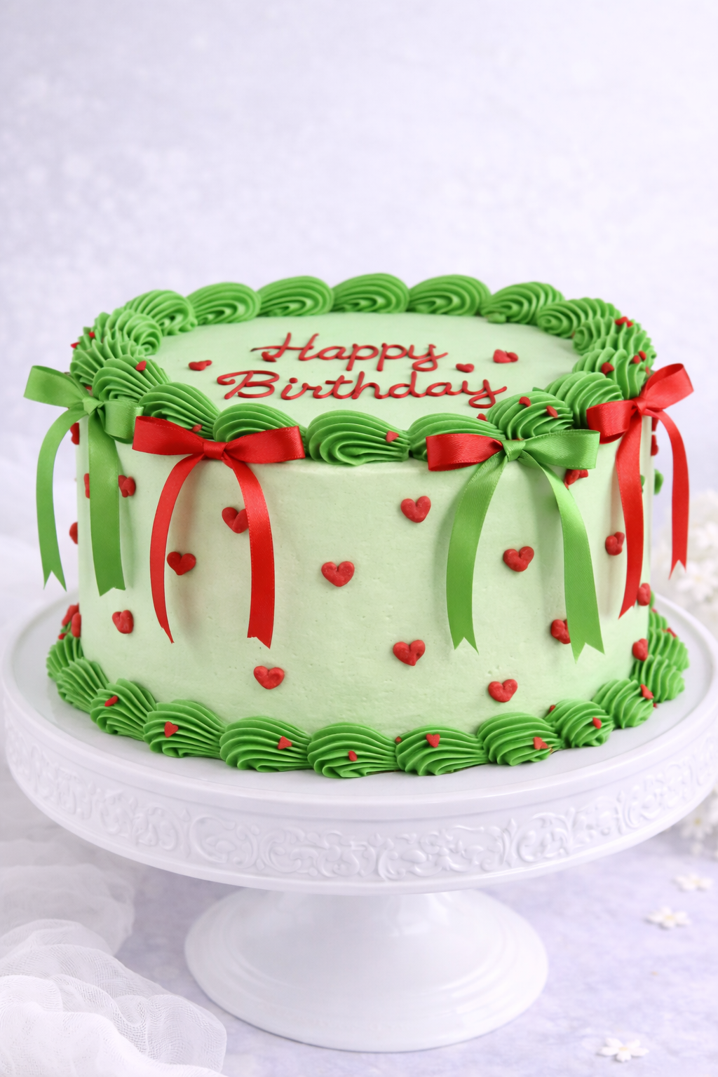 This elegant Green + Red Cake of hearts features a smooth buttercream finish decorated with delicate piped hearts and a bold swirl border for a chic, modern look.