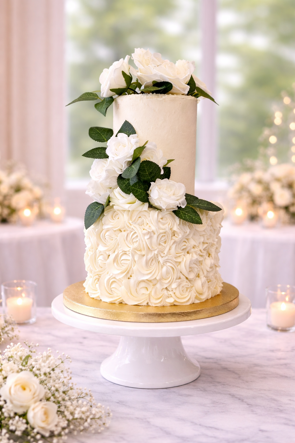 This luxury rosette wedding cake features a textured buttercream rosette design paired with artificial white florals for a soft, romantic, and elegant look.