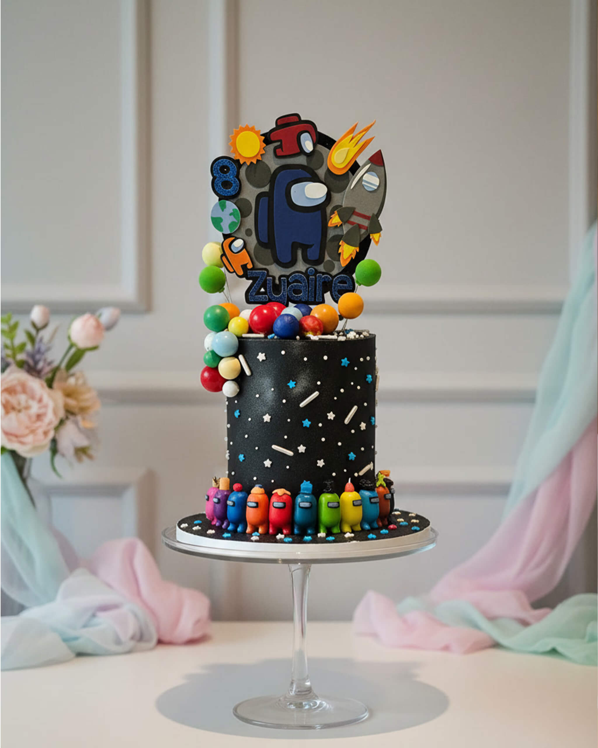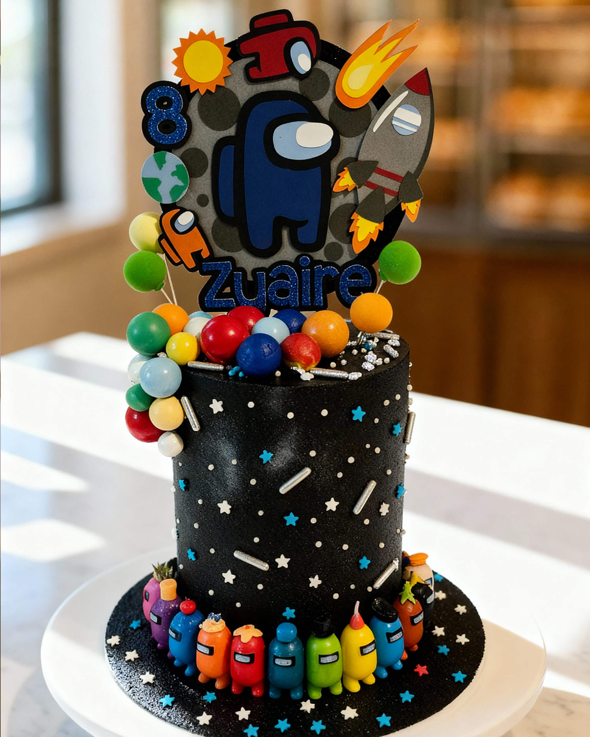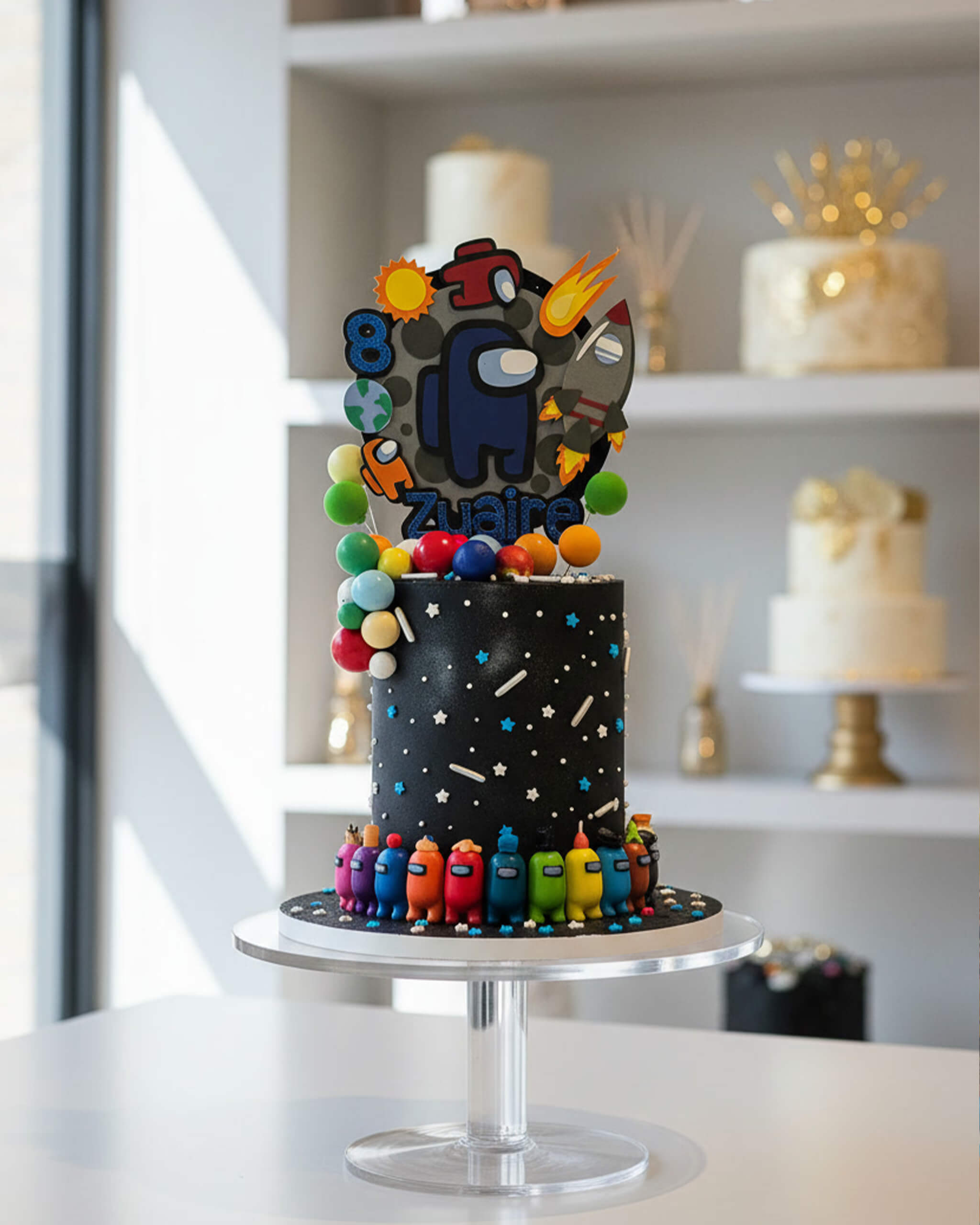 Perfect for children who love everything about space and crewmates - our Astronaut Space Cake is seriously cool and full of fun details. The deep black galaxy buttercream is covered in twinkling edible stars, silver sprinkles, and a colourful cascade of gumball “planets” that kids go crazy for.