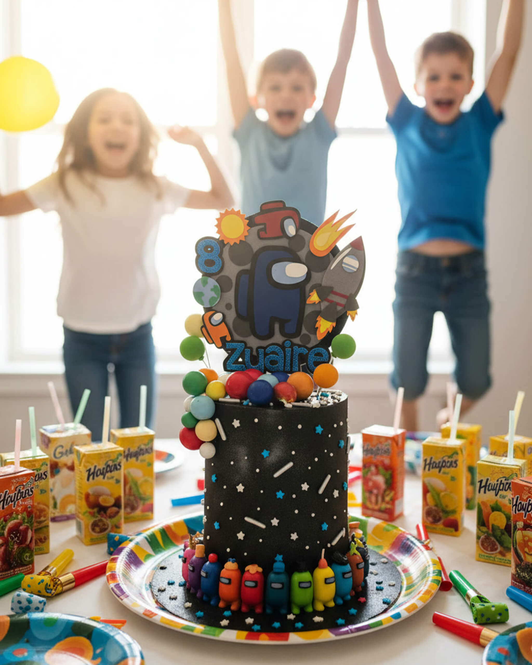 A personalised topper with their name and age sits up top with a big crewmate and blasting rocket, while tiny rainbow astronauts march around the bottom. Pick chocolate, vanilla, red velvet, or any flavour they like inside - this cake tastes as awesome as it looks and will make their birthday feel like a real space mission.
