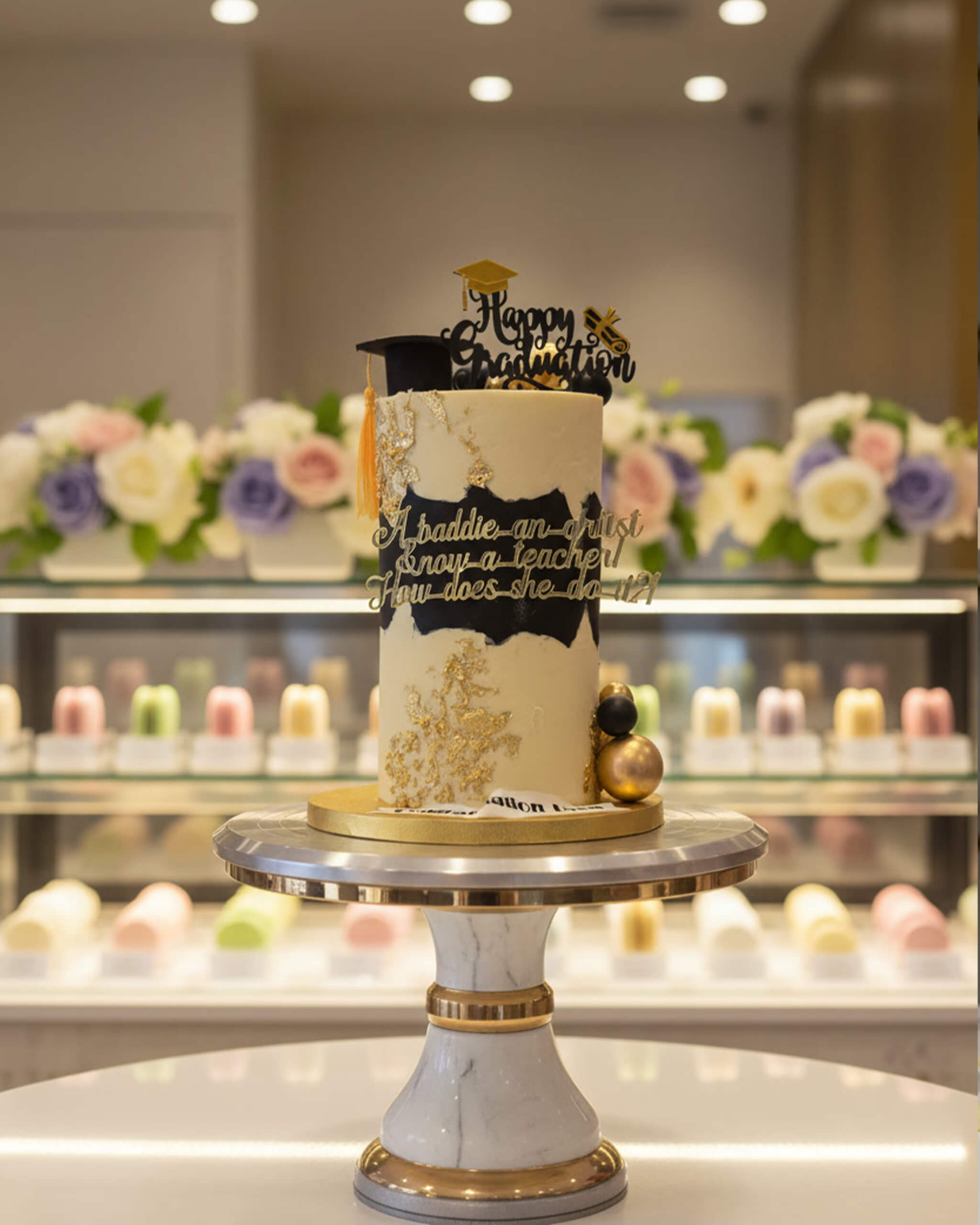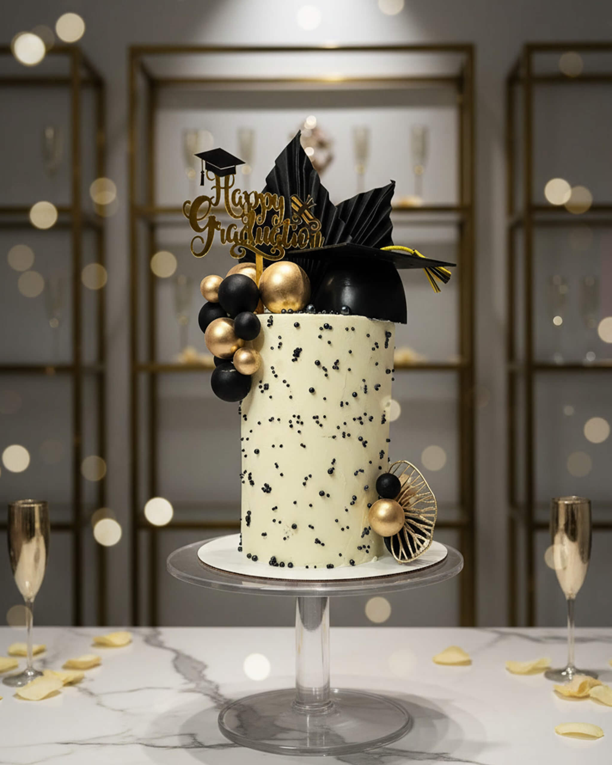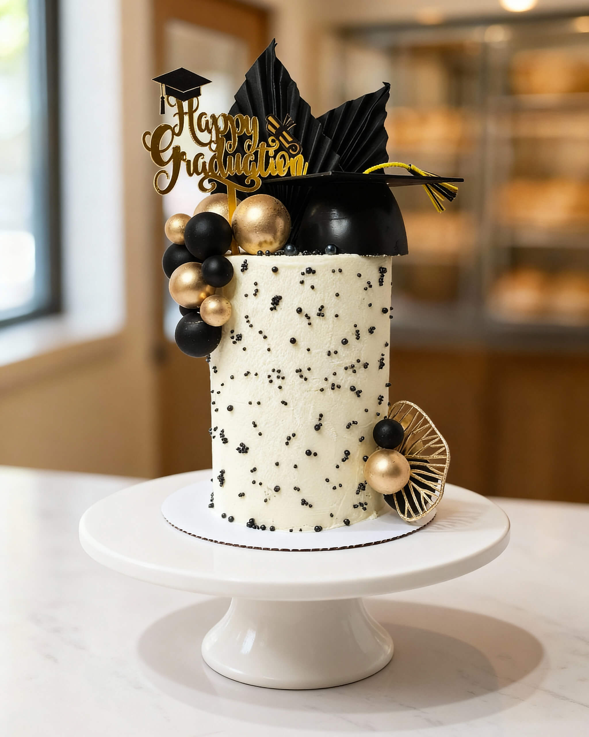 Chic and contemporary, showcasing a fashionable graduate silhouette, luxurious pearl details, fondant diploma with ribbon, and a classic black cap with gold tassel. Your college or university logo can be seamlessly added to the diploma or base for a truly personalized keepsake — the ultimate cake for honoring academic success in style.