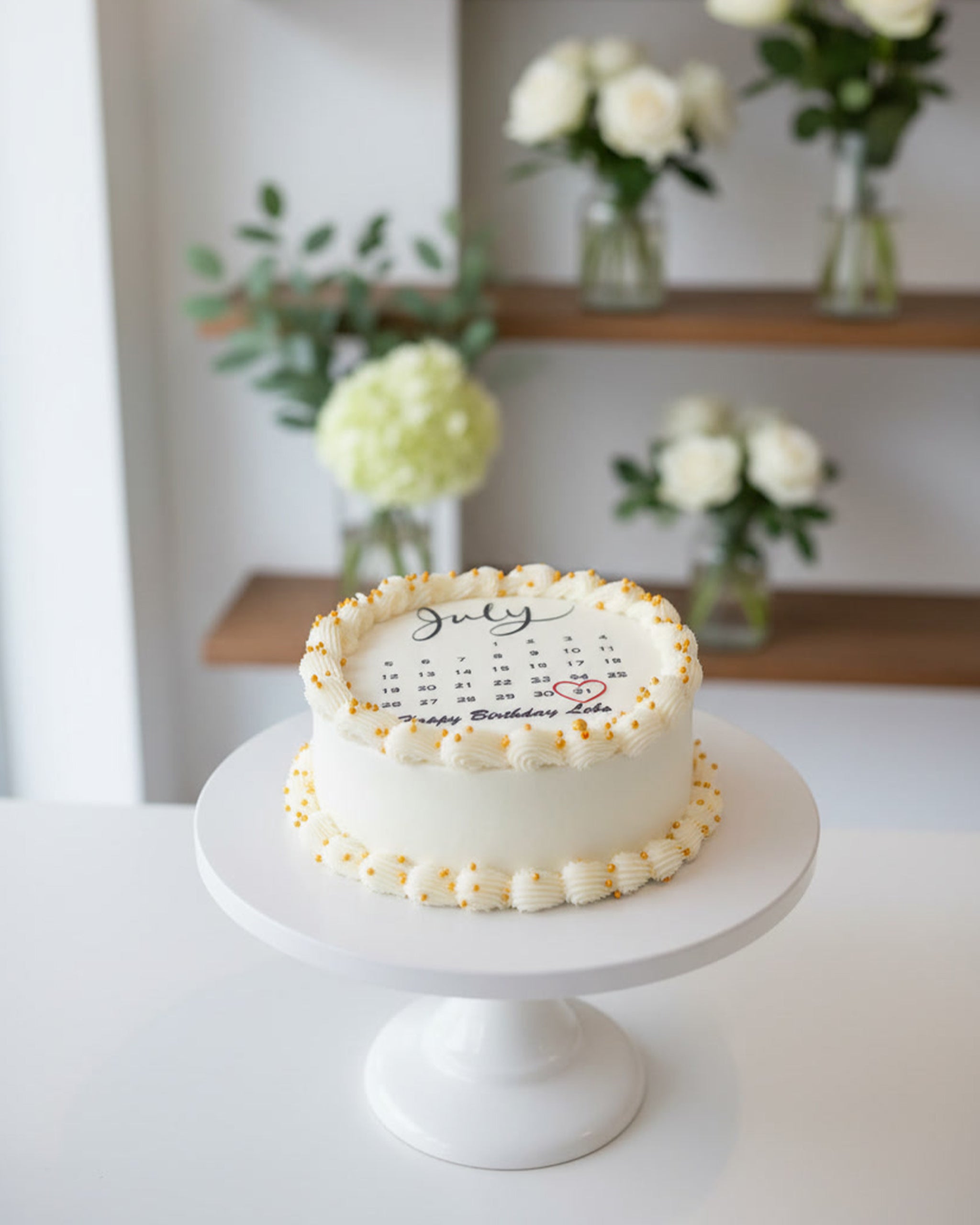 Mark a special moment with our Calendar Mini Cake, a delightful heart-shaped (or round) cake featuring your chosen date beautifully highlighted on top or wrapped around the sides. Freshly baked and finished with soft vintage-style piping, it’s a thoughtful way to celebrate birthdays, anniversaries, or any milestone worth remembering.
