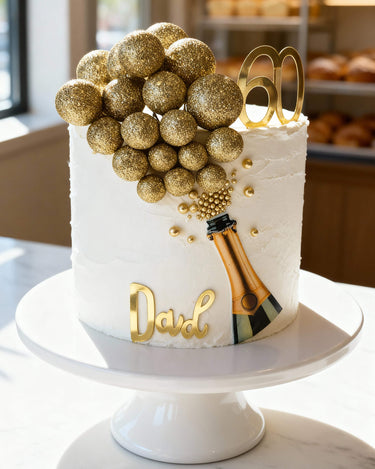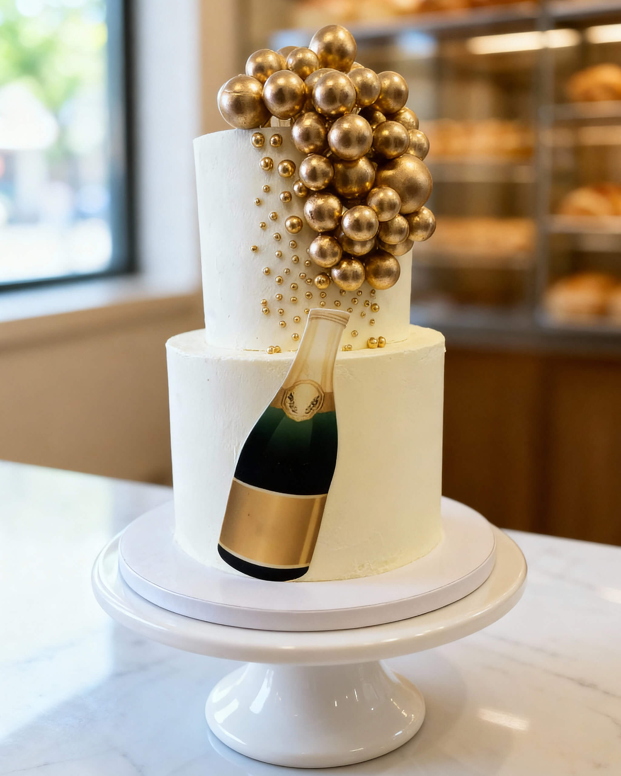 A playful and luxurious design sculpted into a realistic champagne bottle, complete with a bursting cascade of handcrafted golden bubbles spilling from the neck.