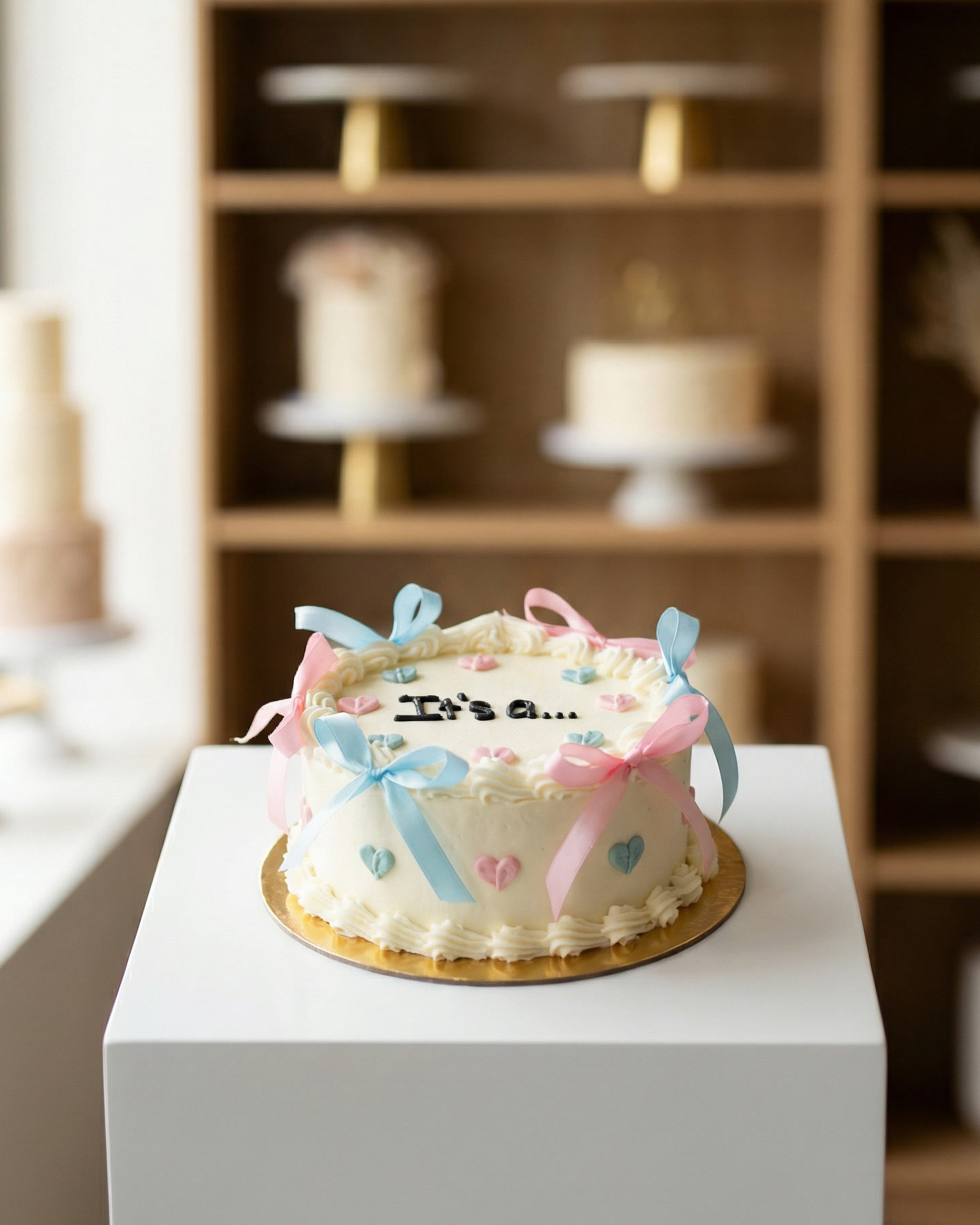 Customize your mini cake to suit your style: choose from sizes that serve 4-8 people, delicious flavors like vanilla, chocolate, or red velvet, and even adjust the frosting colors. Reveal pink for a girl or blue for a boy when you cut in – add gender details at checkout for a sealed surprise!