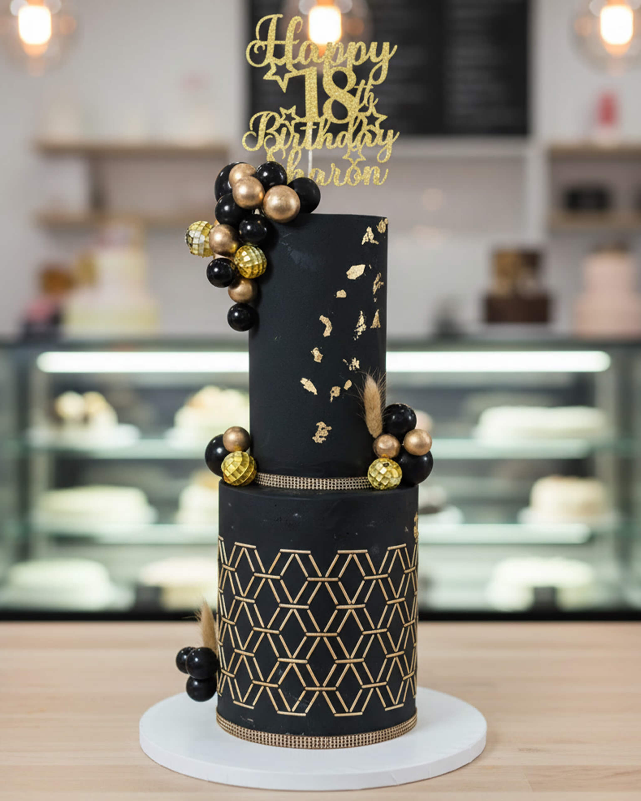 An elegant and modern celebration cake featuring intricate hand-stenciled geometric gold patterns, cascading clusters of metallic and matte fondant spheres, delicate edible gold leaf accents, and subtle rhinestone trim.