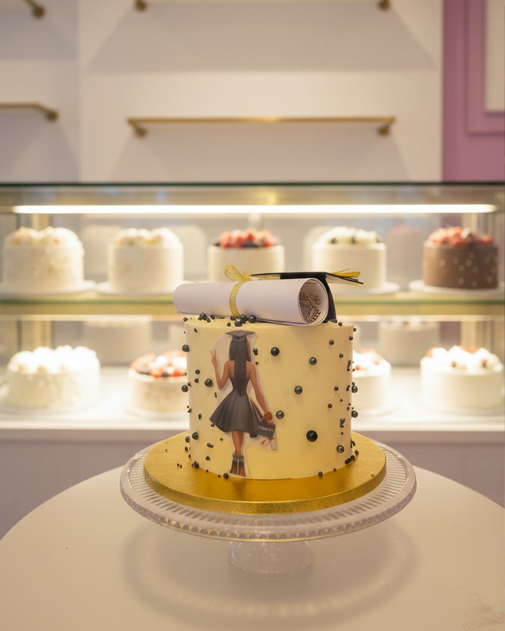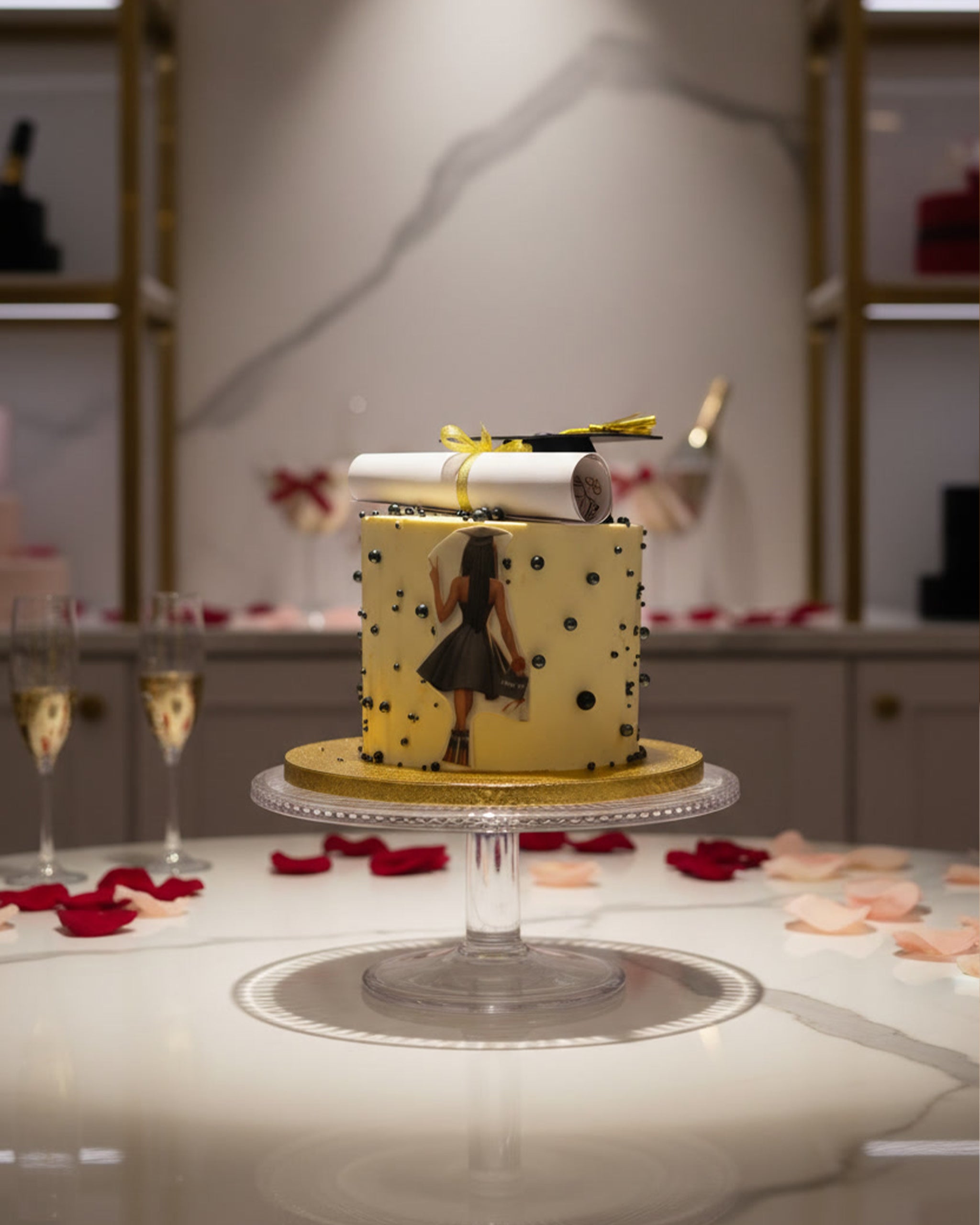 Chic and contemporary, showcasing a fashionable graduate silhouette, luxurious pearl details, fondant diploma with ribbon, and a classic black cap with gold tassel. Your college or university logo can be seamlessly added to the diploma or base for a truly personalized keepsake — the ultimate cake for honoring academic success in style.