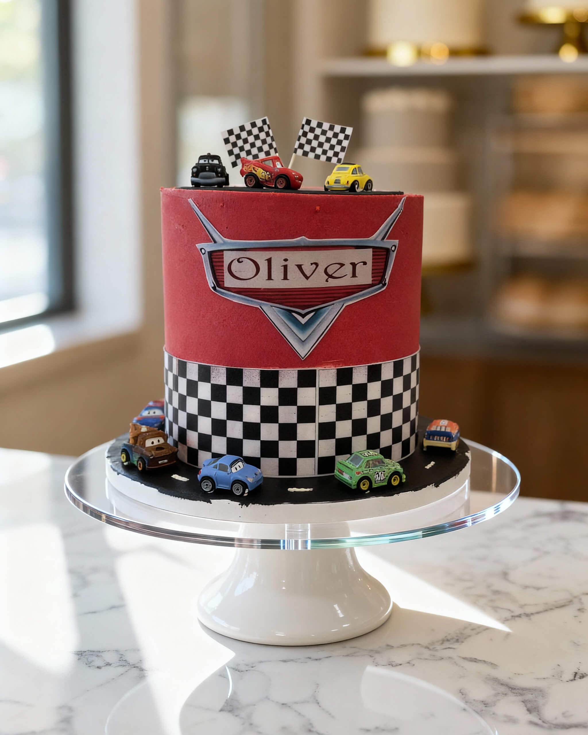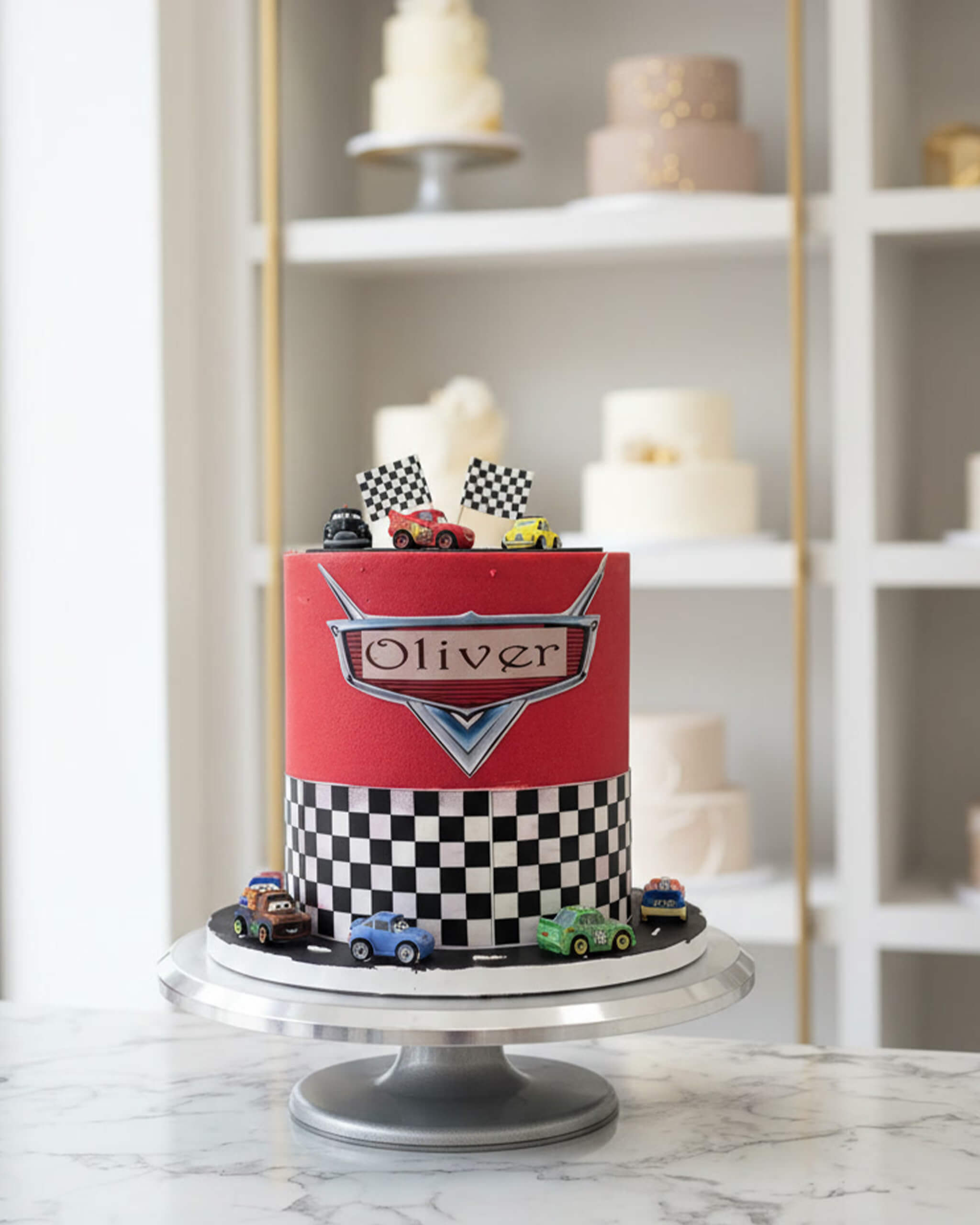 Get ready for some high-speed fun with our Lightning Race Car Cake – perfect for little racers who love Pixar’s Cars! The bold red top features the famous Lightning McQueen badge (customised with their name), while the classic black-and-white checkered pattern wraps around like a real finish line. Tiny fondant cars – Lightning, Mater, Cruz, and the whole crew – zoom around the base and wave checkered flags up top.