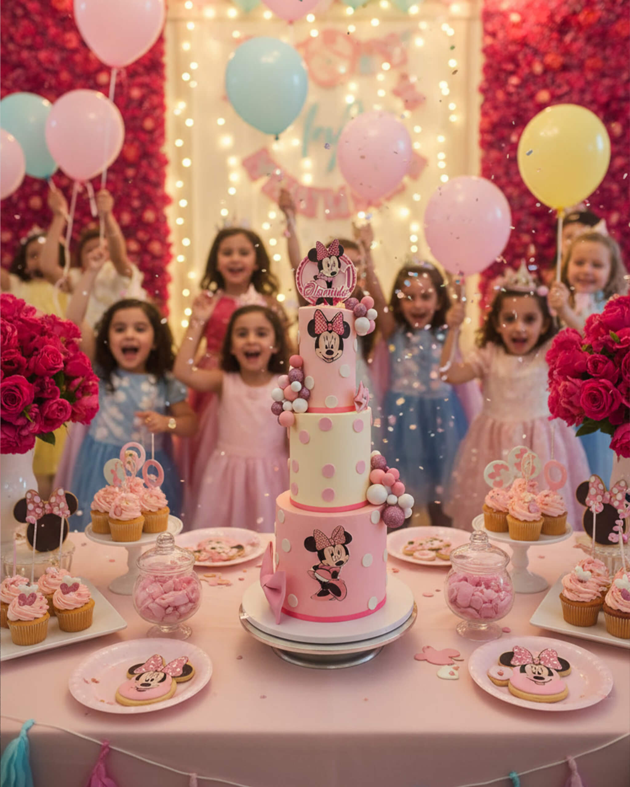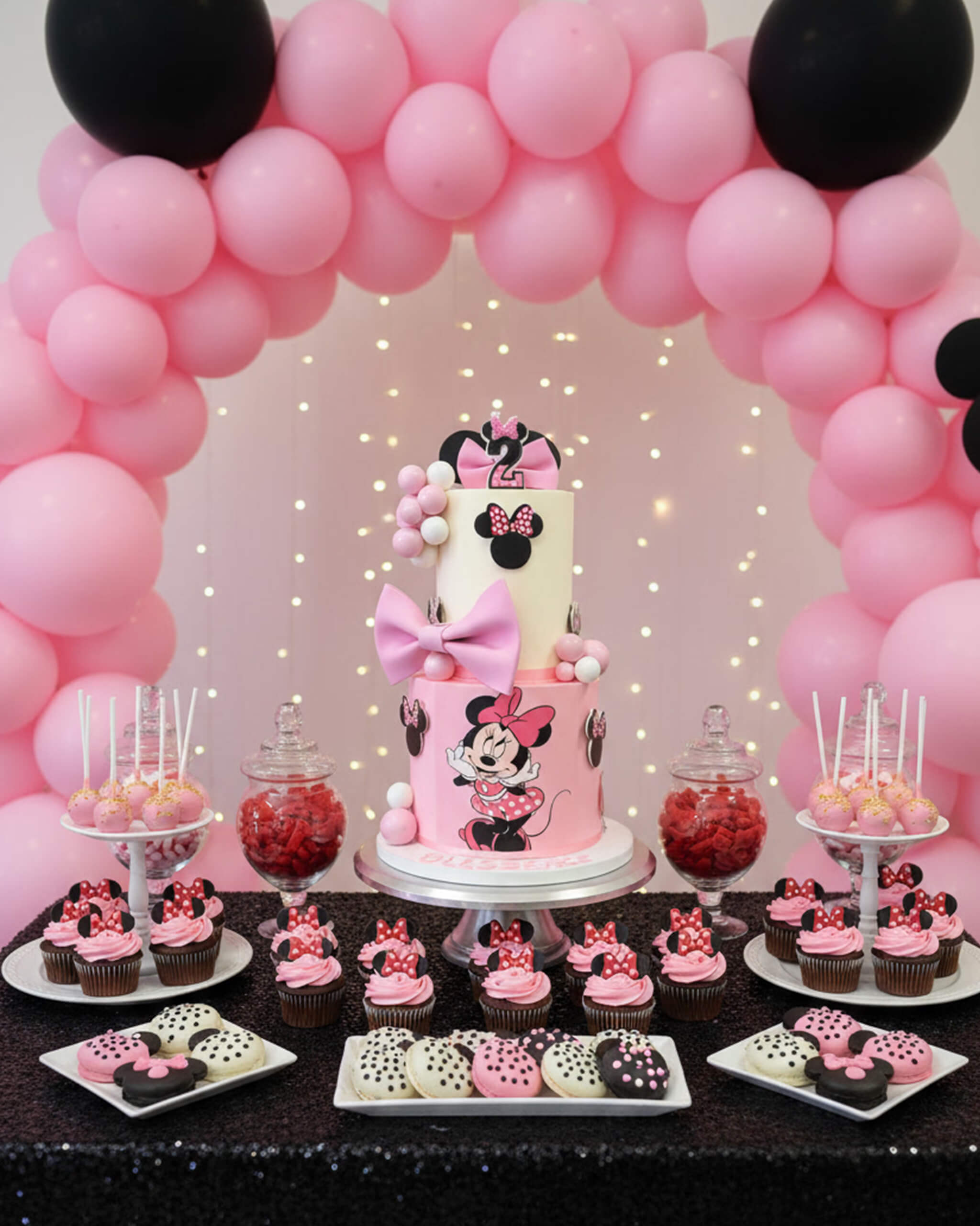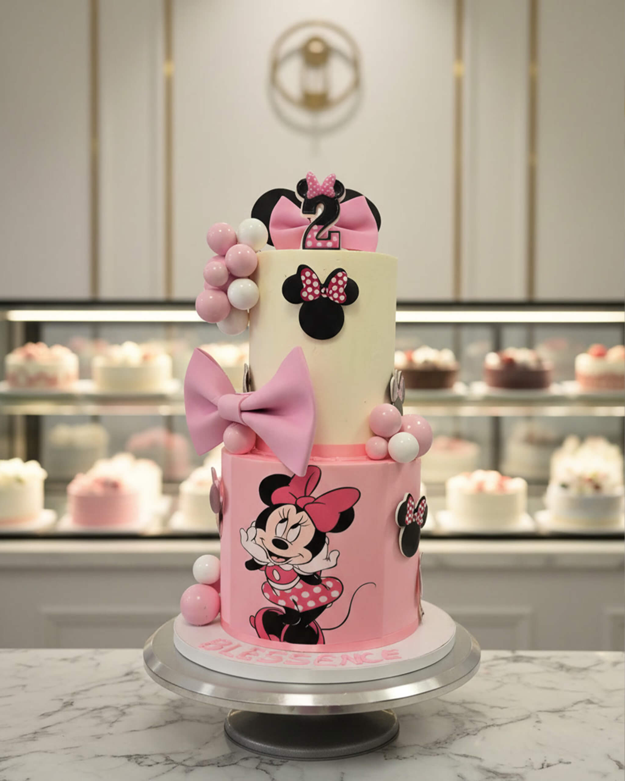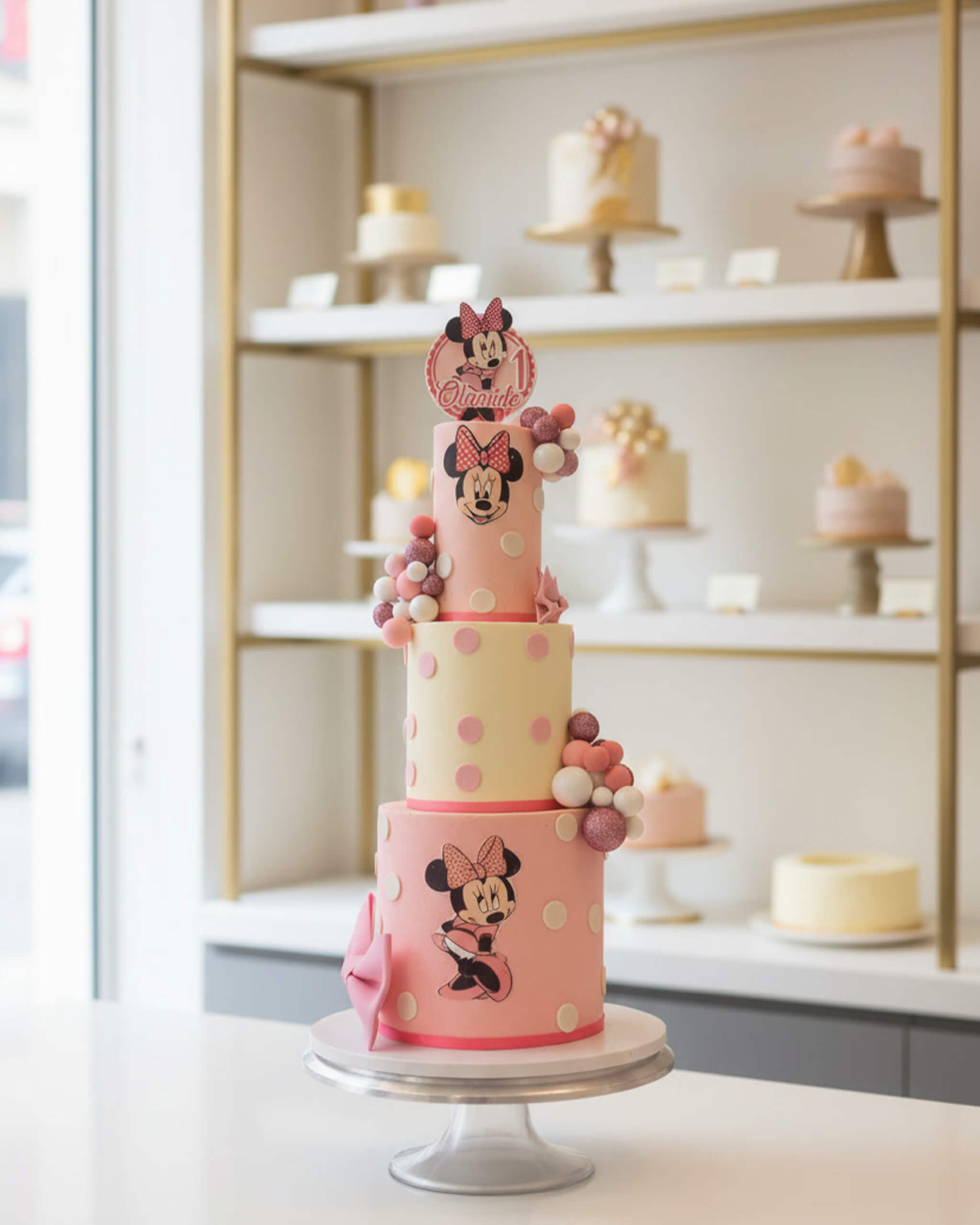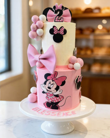 Our Minnie Mouse Cake is every little one's dream come true! Soft pink and cream tiers are covered in polka dots, big fondant bows, sparkly chocolate spheres, and hand-painted or printed Minnie Mouse faces that look just like the real deal.
