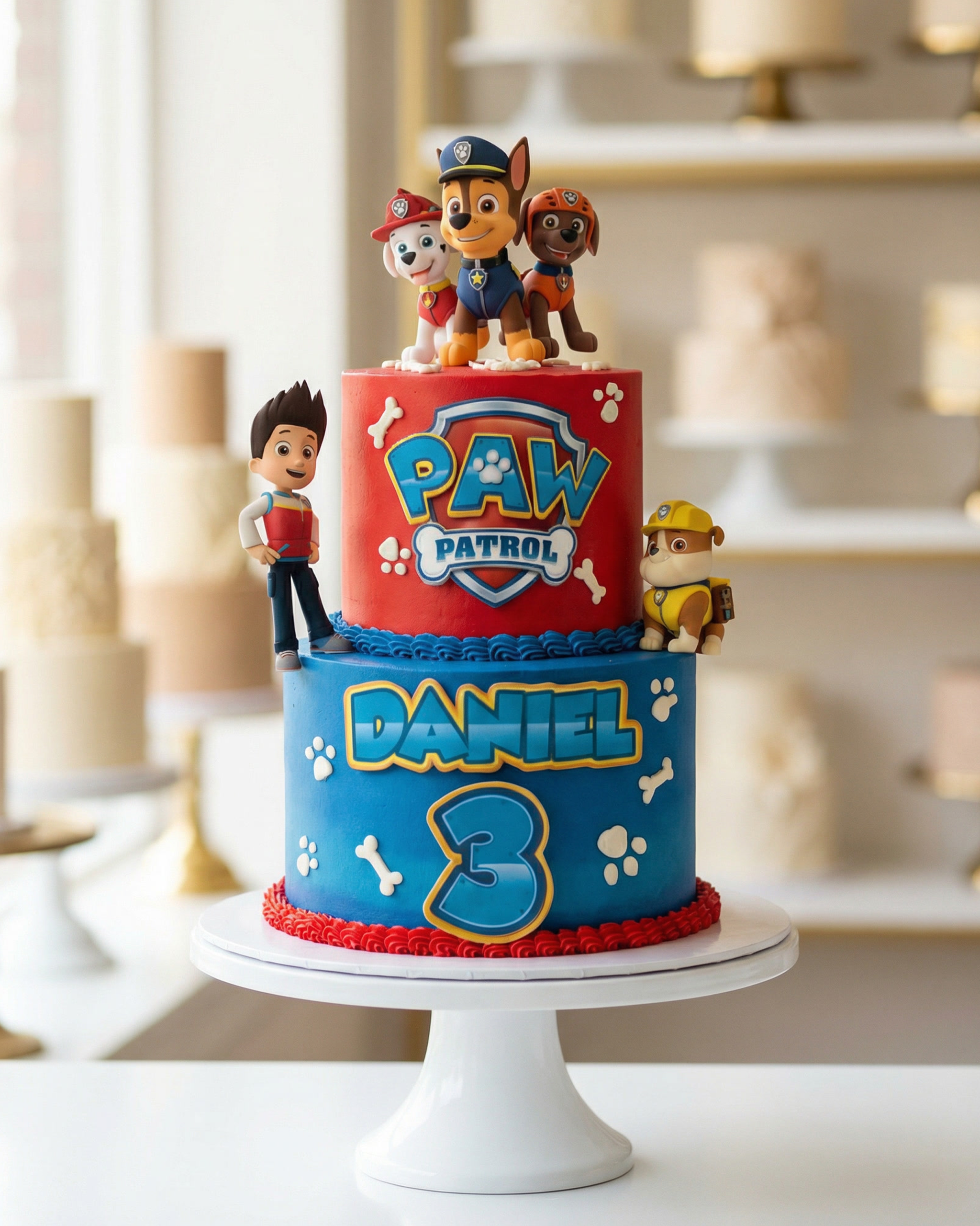 This Paw Patrol–themed cake is a fun and colorful design featuring beloved characters in bold, playful details that kids instantly recognize and love. Decorated with vibrant red and blue tones, character figurines, and custom name and age elements, this cake is designed to be the highlight of any Paw Patrol birthday celebration.