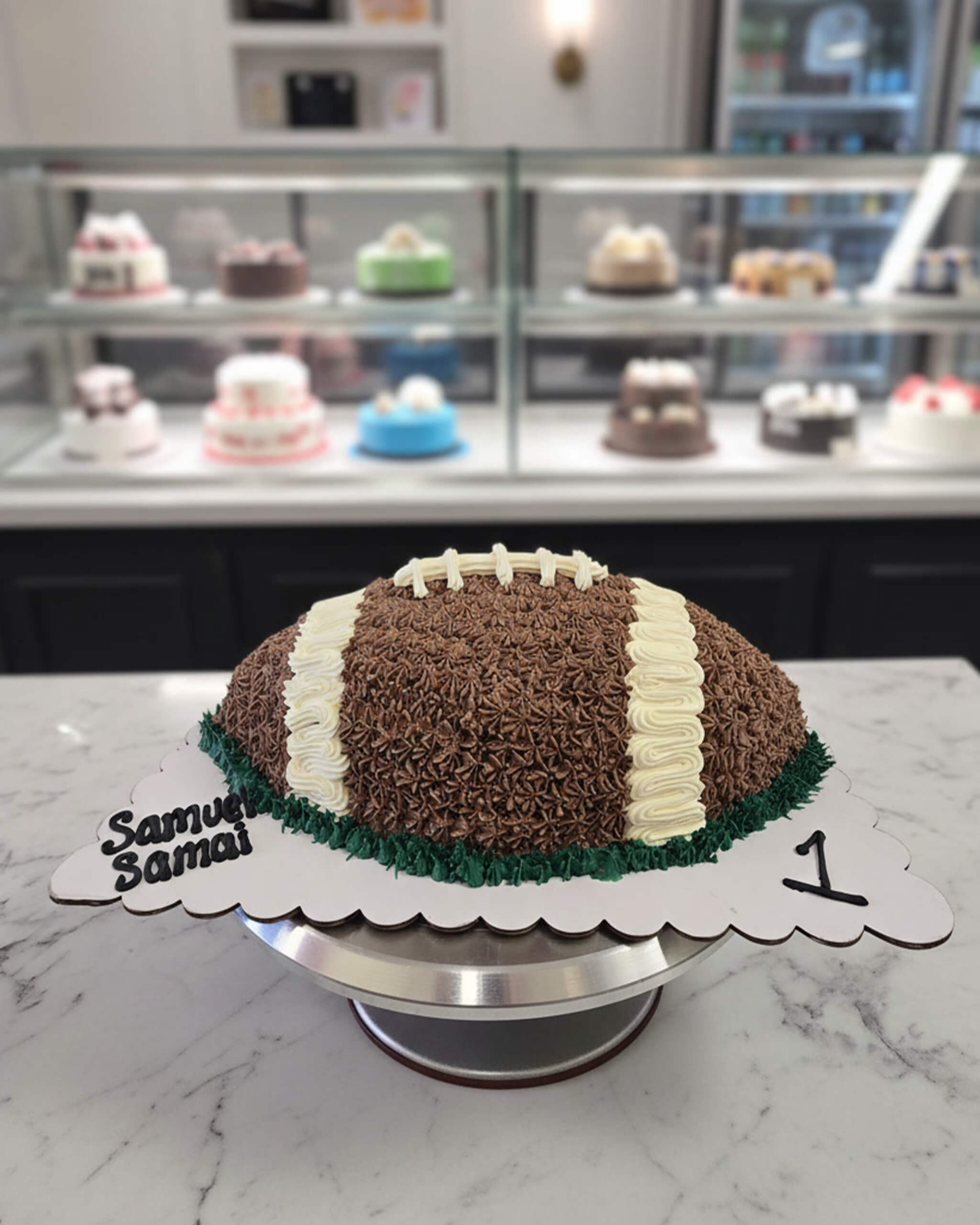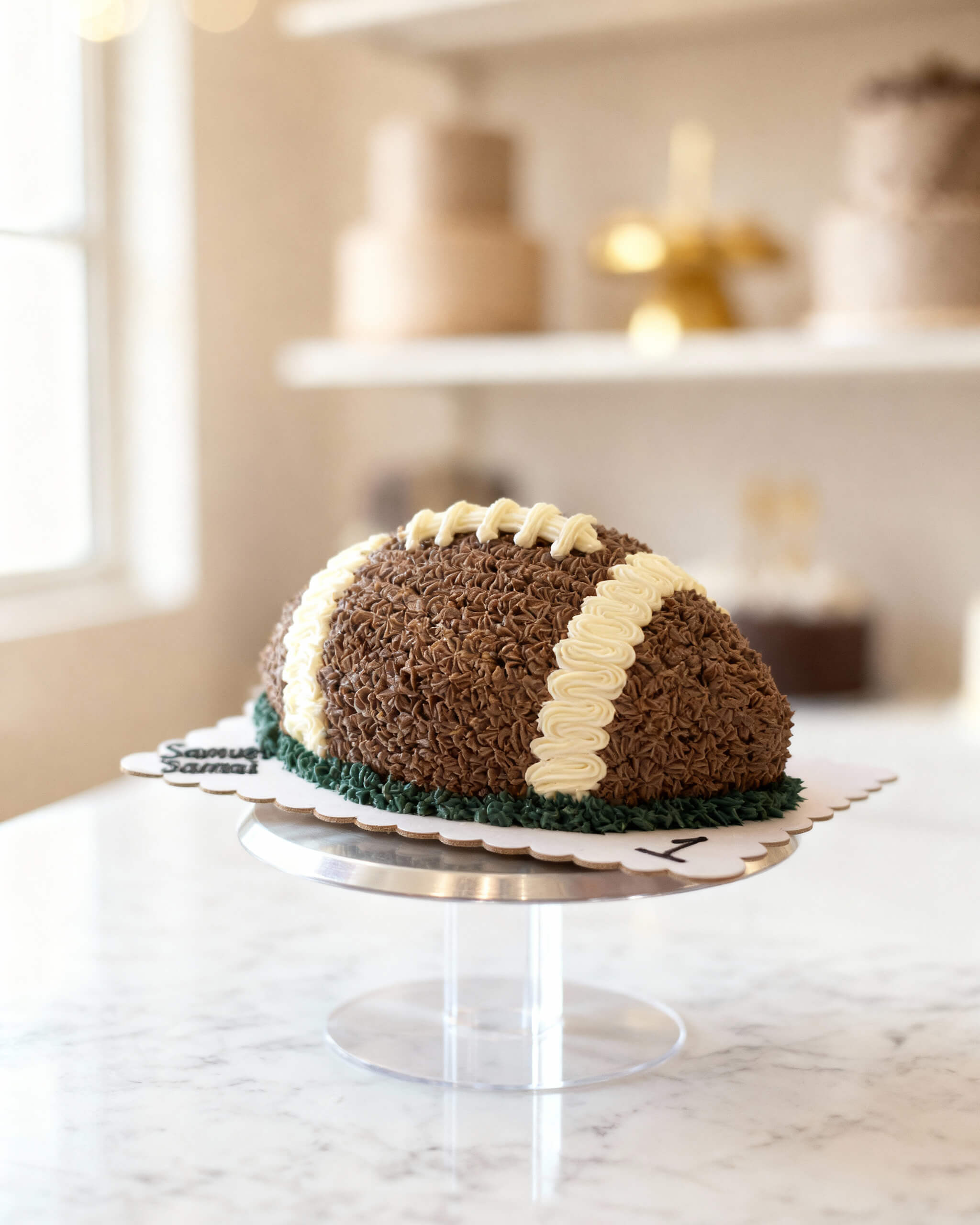 Kick off the celebration with our Rugby Ball Cake – a fun, spot-on treat for any rugby lover! Hand-shaped and covered in rich chocolate buttercream “pebbled” to look just like a real rugby ball, complete with piped white laces and a grassy green base.