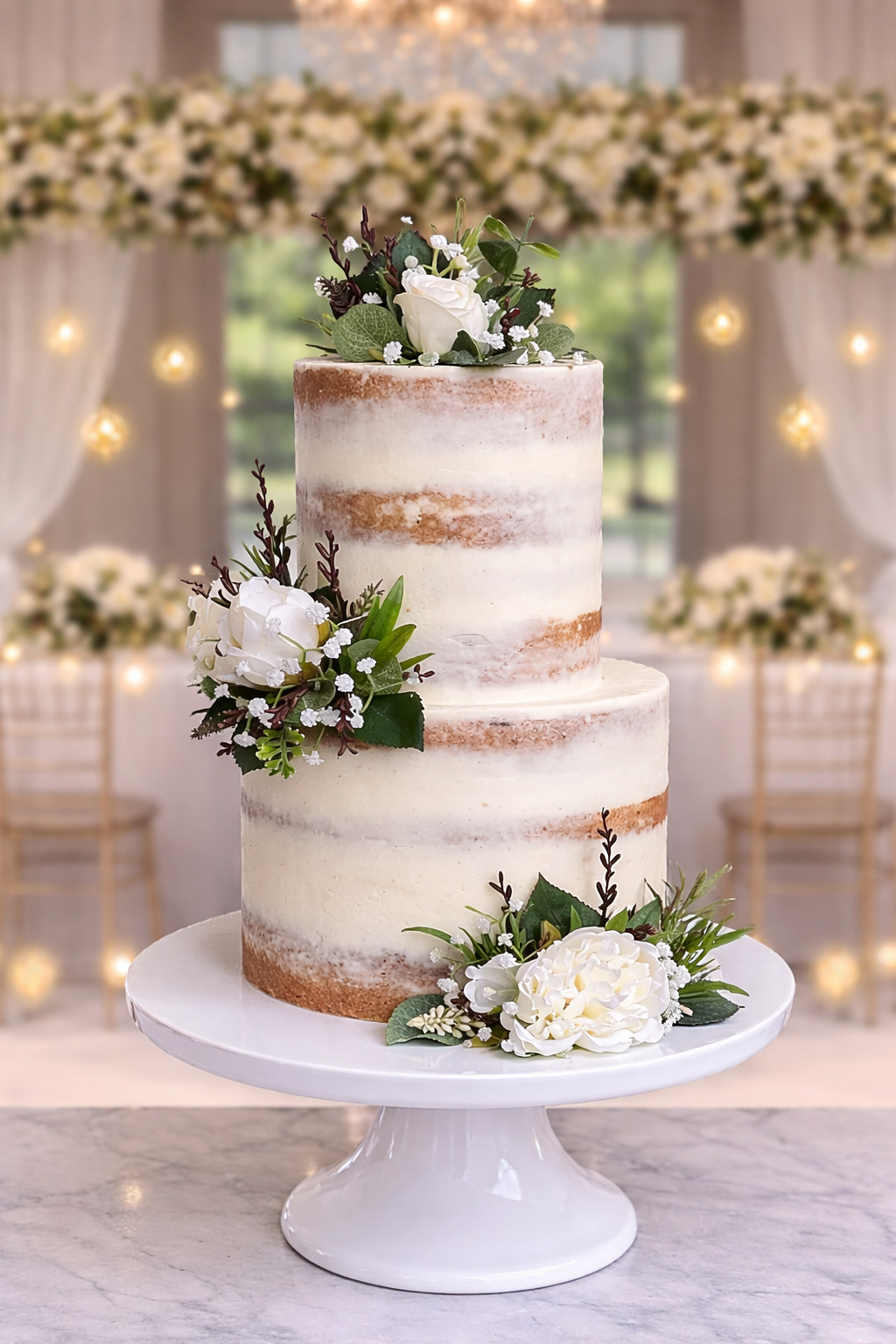 This rustic naked wedding cake features a semi-naked buttercream finish with soft layers showing through, accented with fresh white florals and greenery for a natural, romantic look.