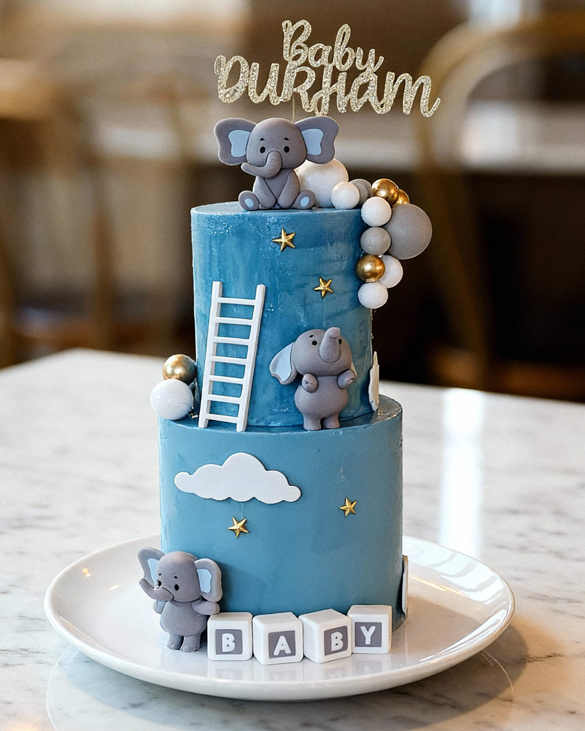 Delightful hand-modeled fondant elephants climbing toward the stars, surrounded by fluffy clouds, elegant balloon garlands in mixed finishes, delicate gold stars, and personalized “BABY” blocks. A sweet and modern choice that captures the excitement of welcoming a new baby - perfect for baby showers, gender reveals, or family gatherings.