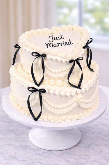 This vintage heart wedding cake features a classic buttercream finish with intricate piped detailing, elegant swags, and delicate ribbon bow accents.