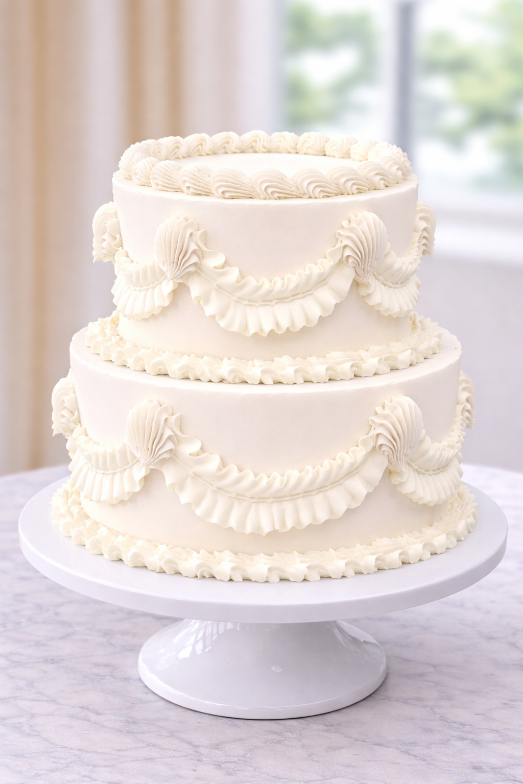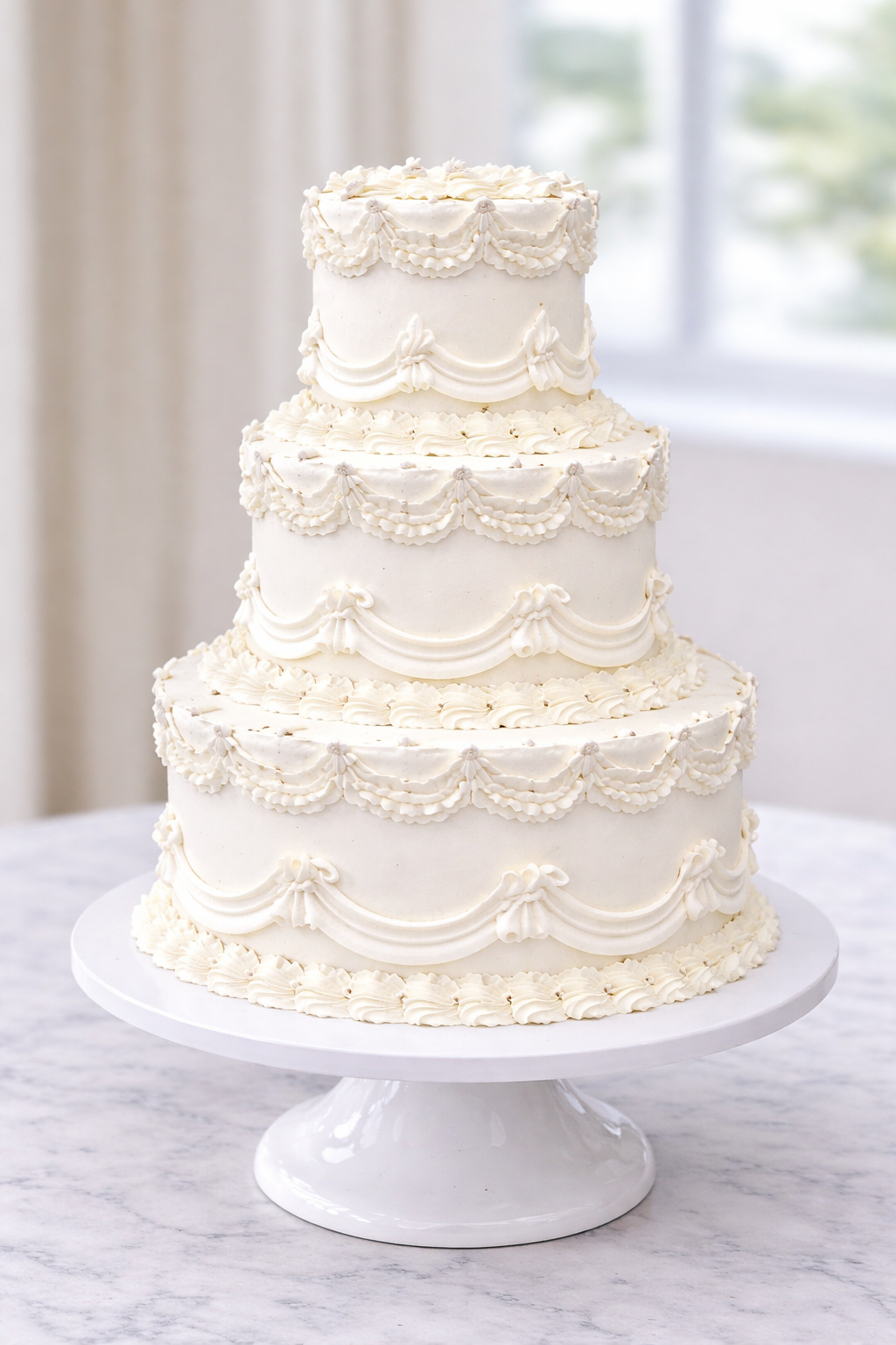 This vintage wedding cake features a smooth buttercream finish with intricate detailing, including elegant swags, borders, and textured accents for a timeless look.