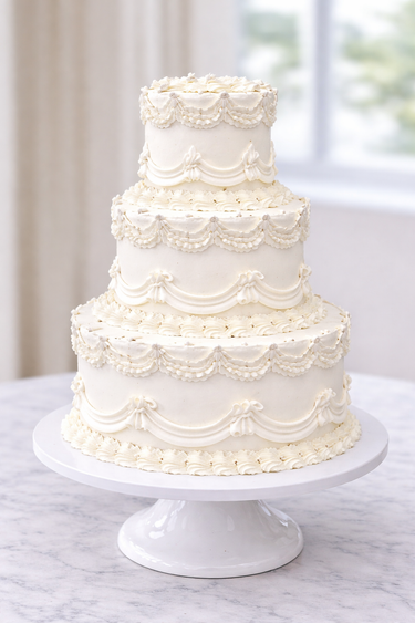 Designed for classic and vintage-inspired weddings, this three-tier cake showcases traditional decorating techniques with a refined and elegant presentation.